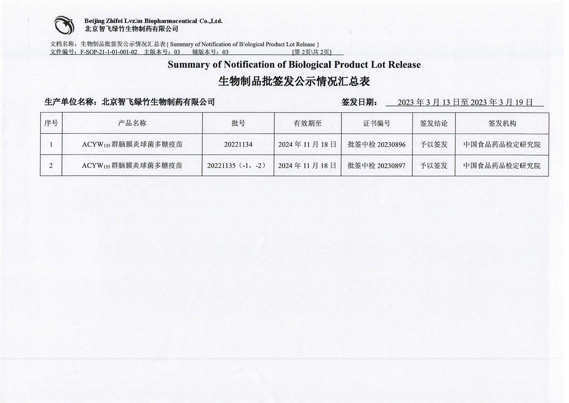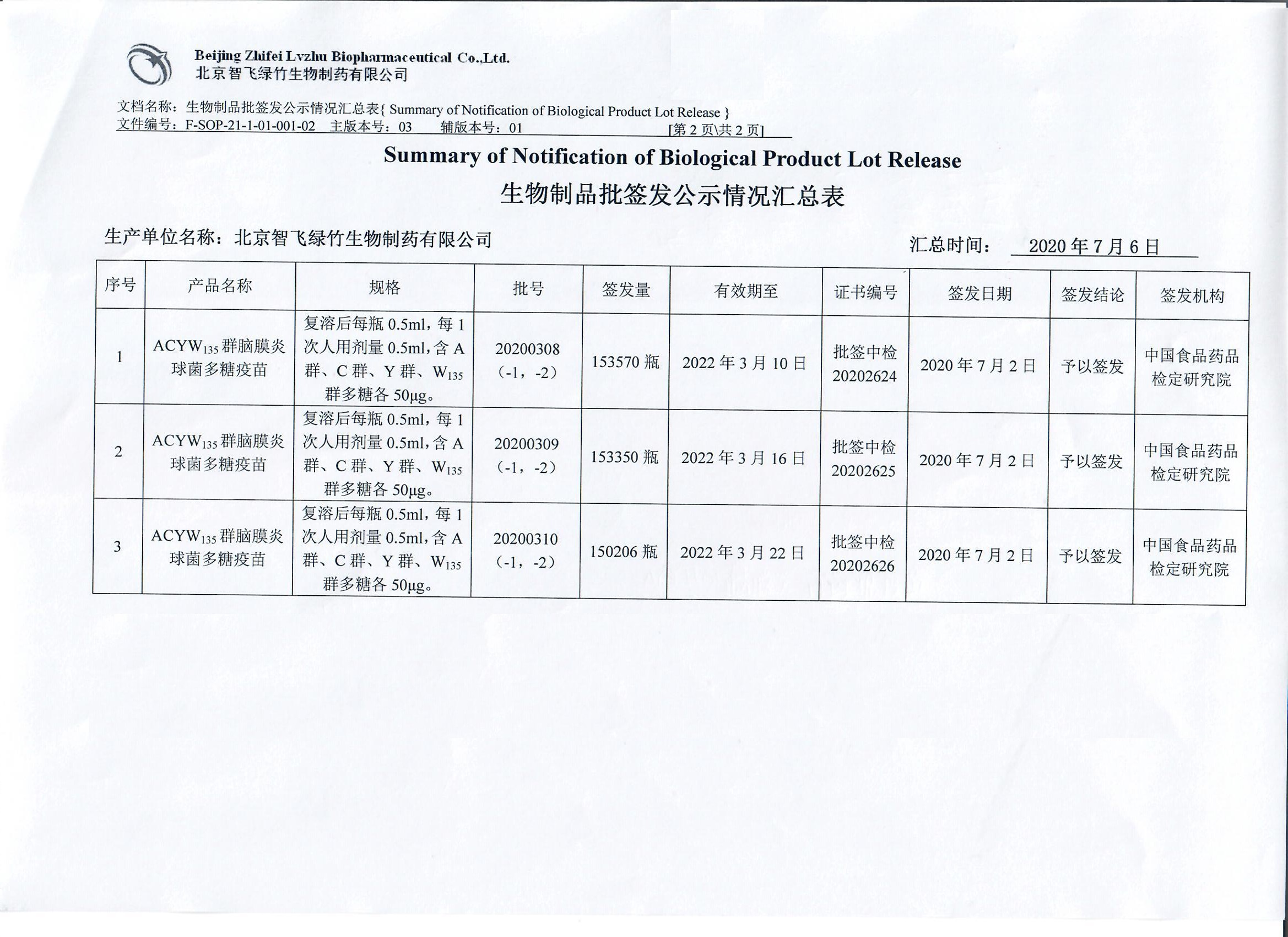 北京智飛綠竹生物制藥有限公司批簽發(fā)情況信息公示如下: